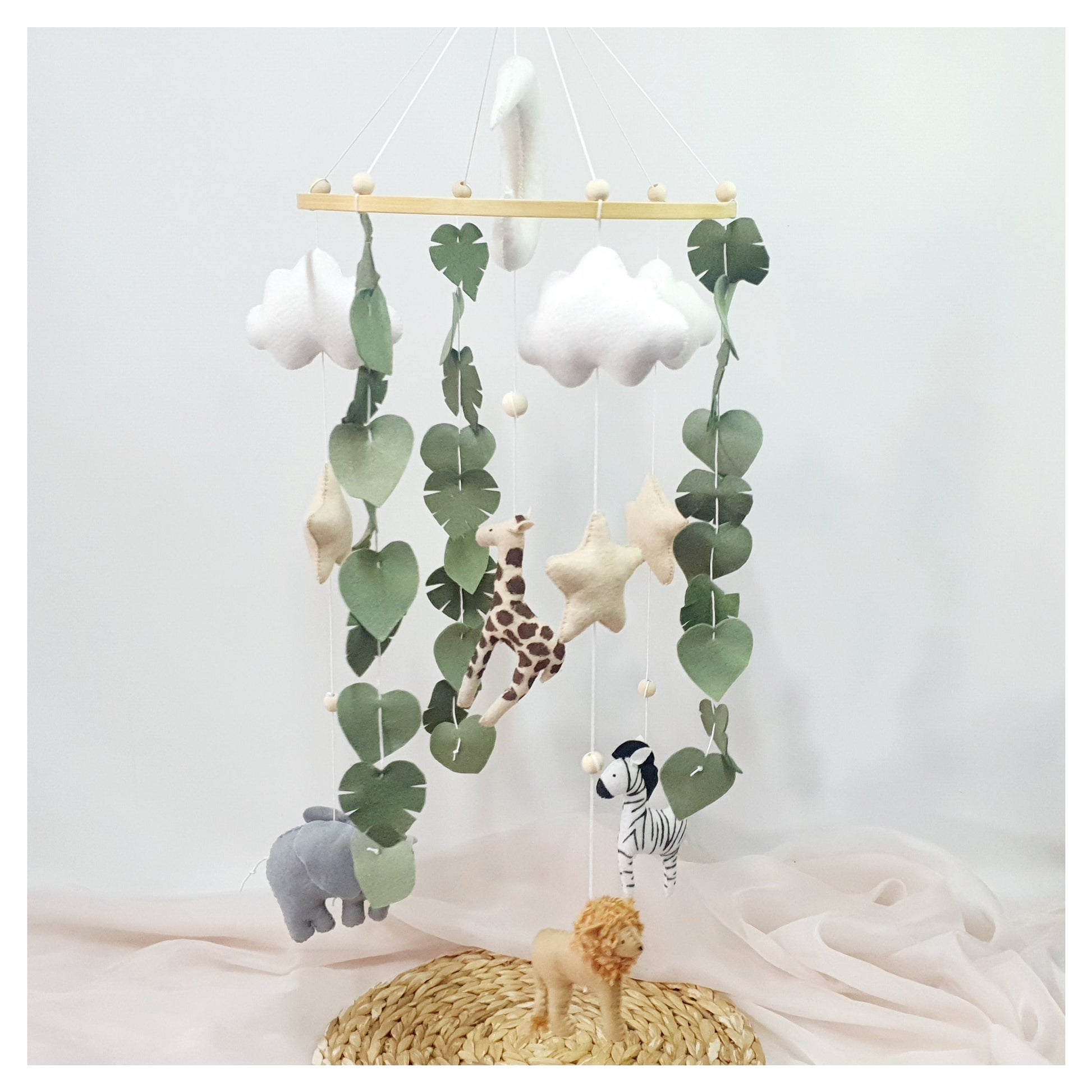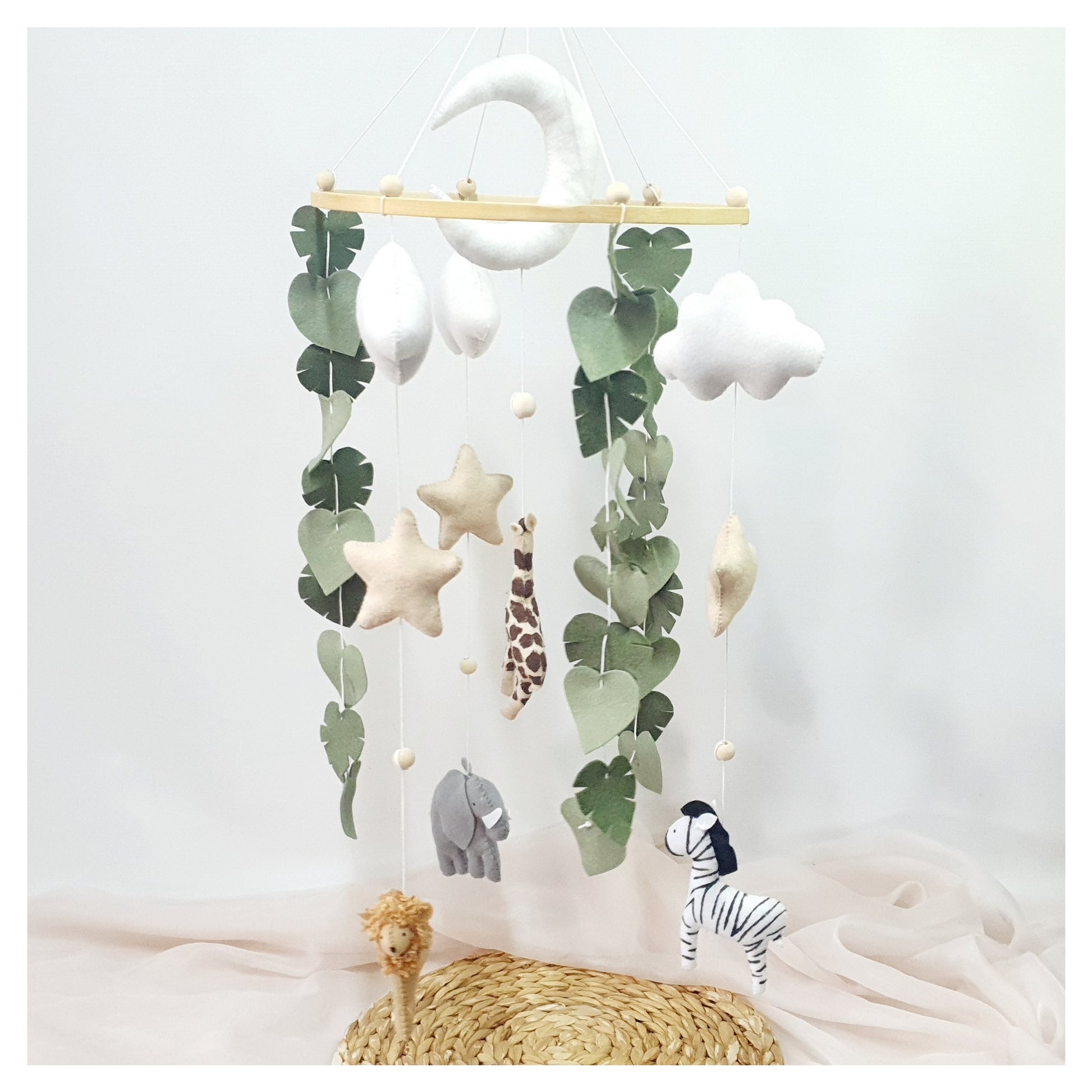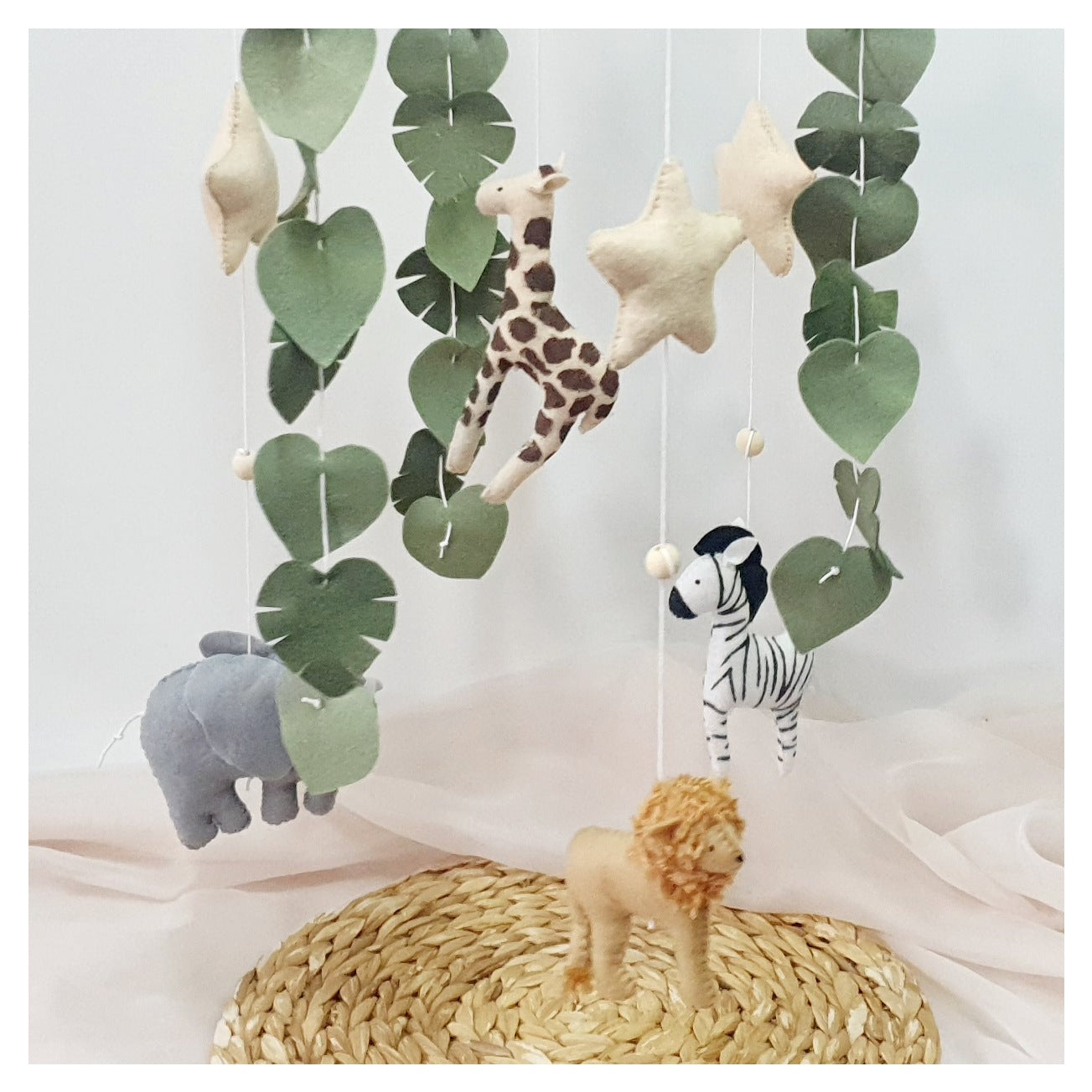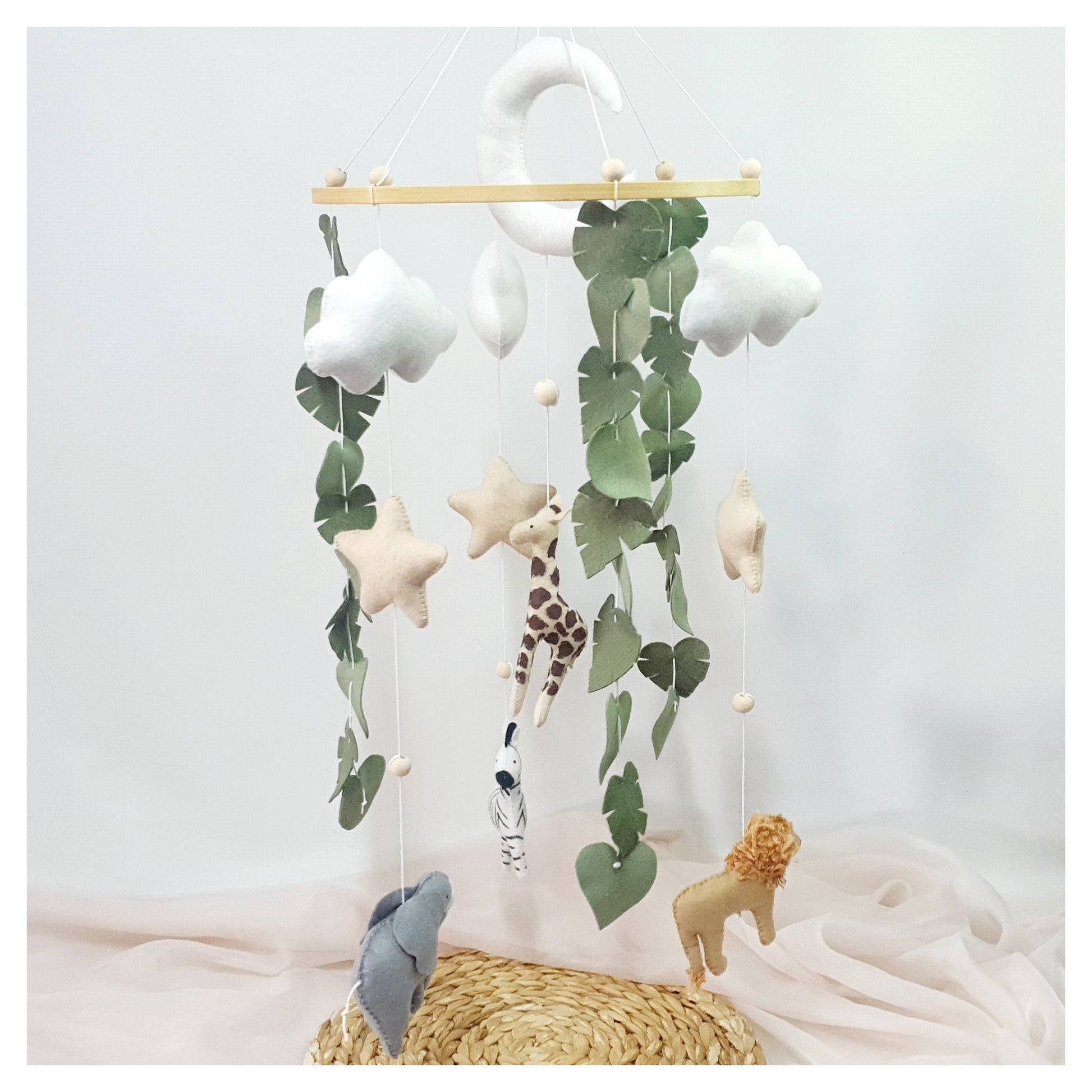 The latest addition to our Safari range, our African Safari Mobile is the perfect décor for a Safari inspired Nursery. The Safari Animals and Leaves are handmade from felt, with a Moon and Giraffe in the center. The Felt pieces are attached to a wooden hoop decorated with wooden beads.