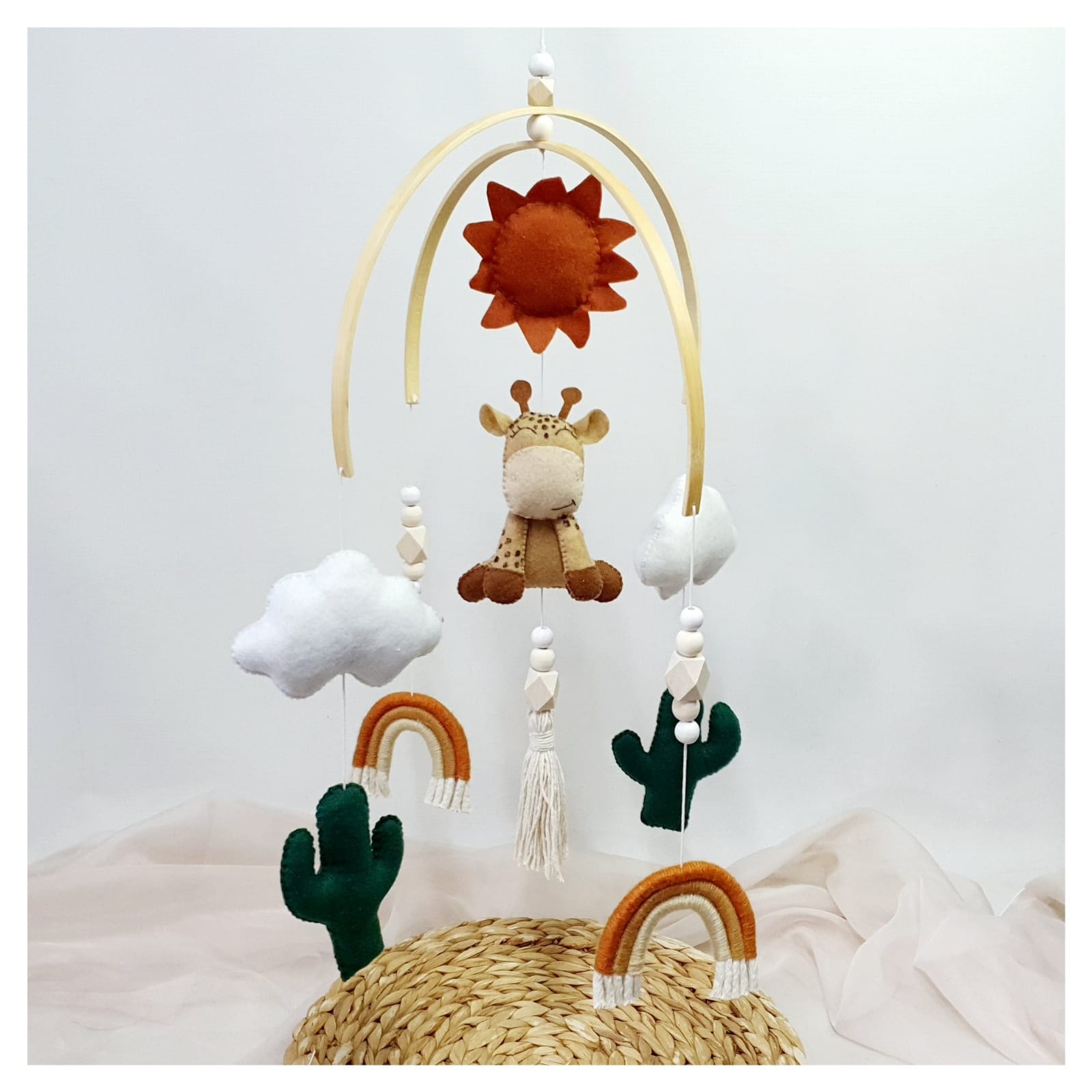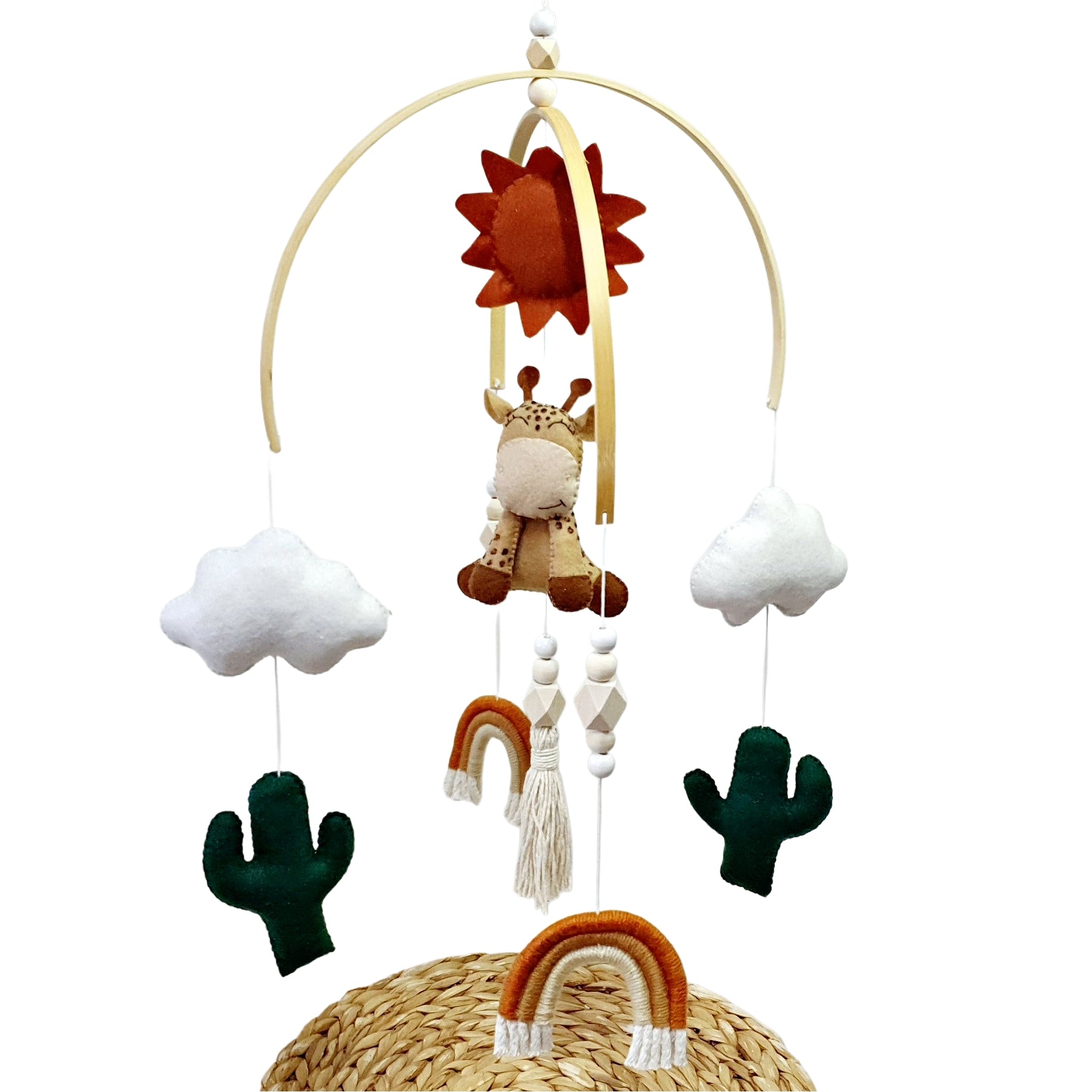 Bring playful charm to your little one’s nursery with the Boho Giraffe Mobile. Handmade felt cactuses, clouds, sun, and a giraffe hang delightfully from bamboo hoops, accented with wooden beads and macrame rainbows. This whimsical mobile adds a warm boho vibe while captivating your baby’s curiosity with its soft textures and gentle movement.